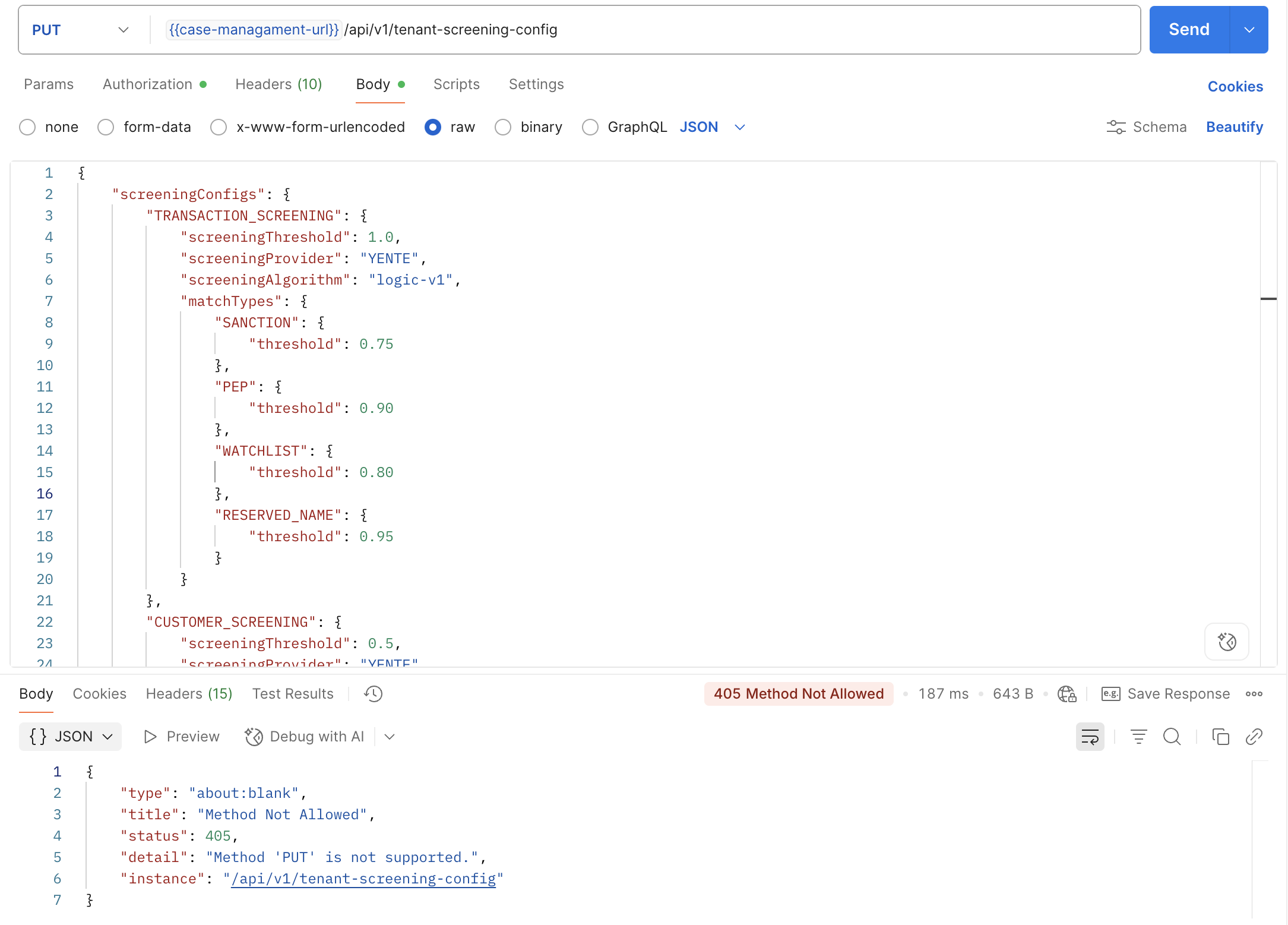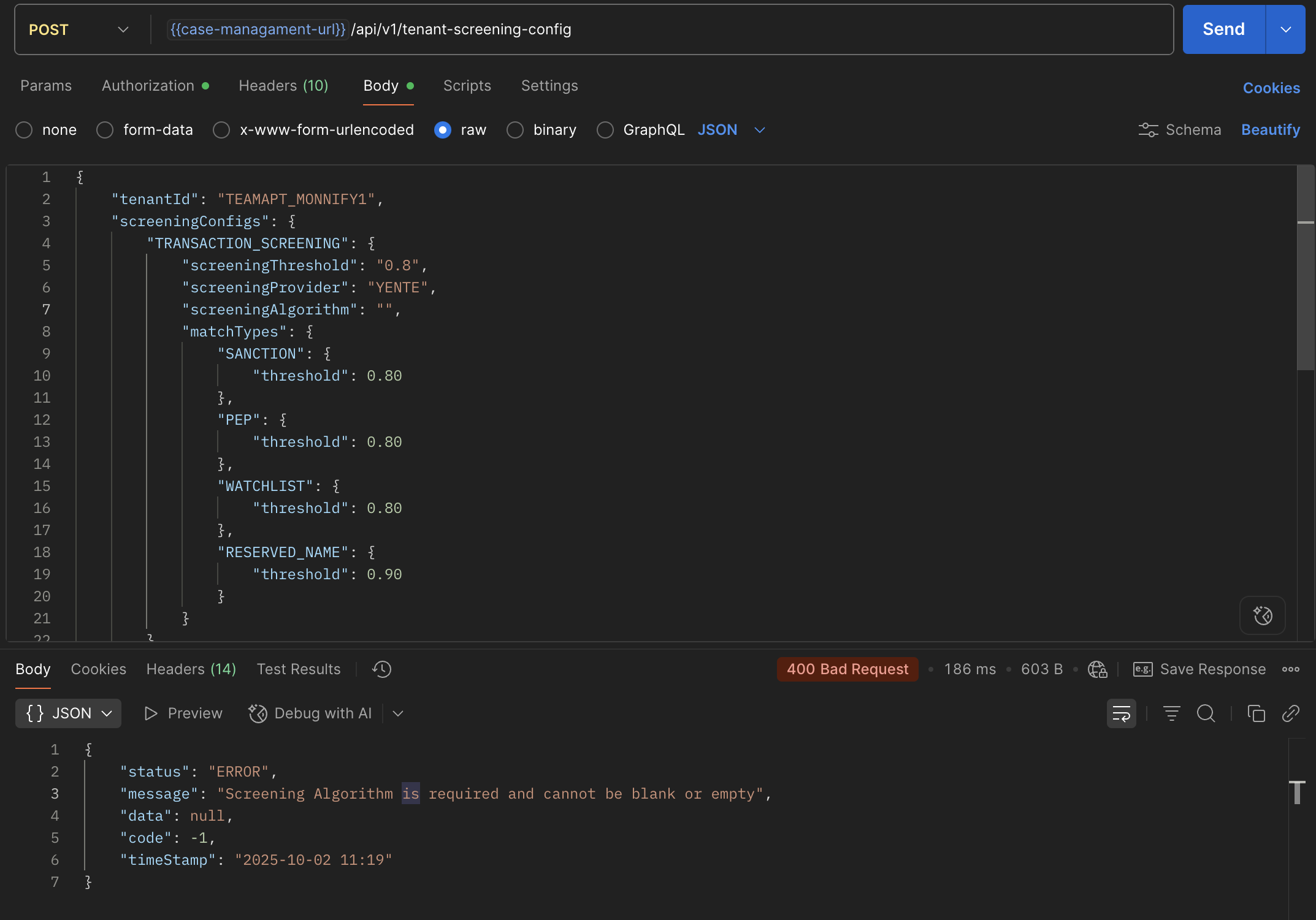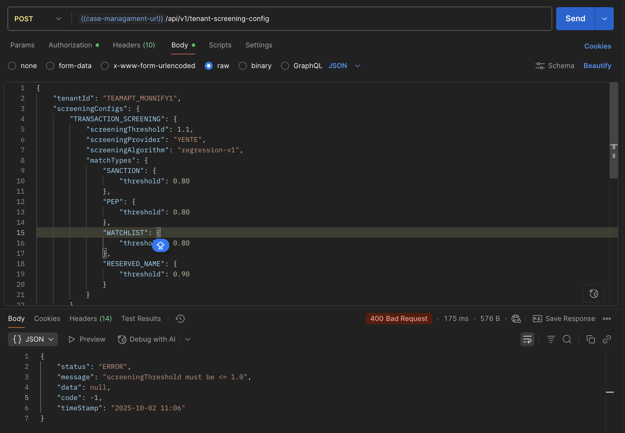 Validating threshold (Boundary) by sending above expected limit (ScreeningThreshold must be <=1.0)